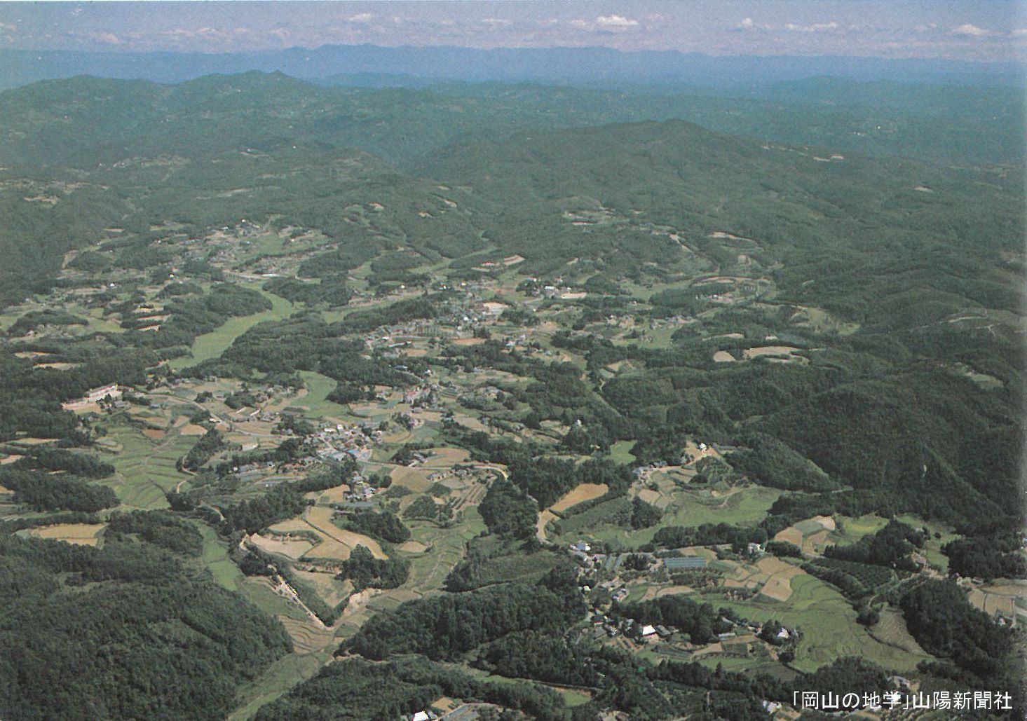 岡山県の地形は大まかに、北は比較的急な中国山地脊梁部、中間部はなだらかな吉備高原、南部は平野部と瀬戸内島嶼部の3つからなり、それらを3大河川(吉井川、旭川、高梁川)が下刻侵食しながら流下して、瀬戸内海に注いでいます。その中の吉備高原には右の写真のように、多くの集落が発達点在しています。