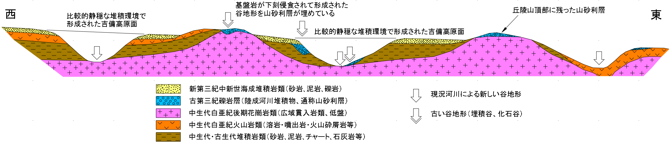 (下記右図は、上記見学内容を踏まえて吉備高原を東西方向の模式断面慨図として描いたものです)
