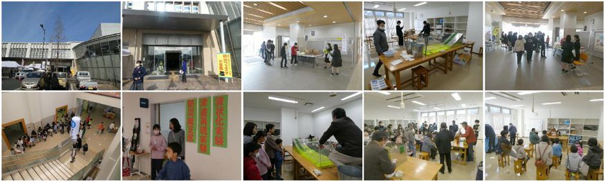 防災教育WGでは2階工作室において、津波再現実験を行い好評を博しました。また「おかやまバトン」(岡山大学)による手作り防災紙芝居が行われ、子供さん方に非常に人気でした。また同室では岡山気象台による液状化の実験も行われました。