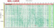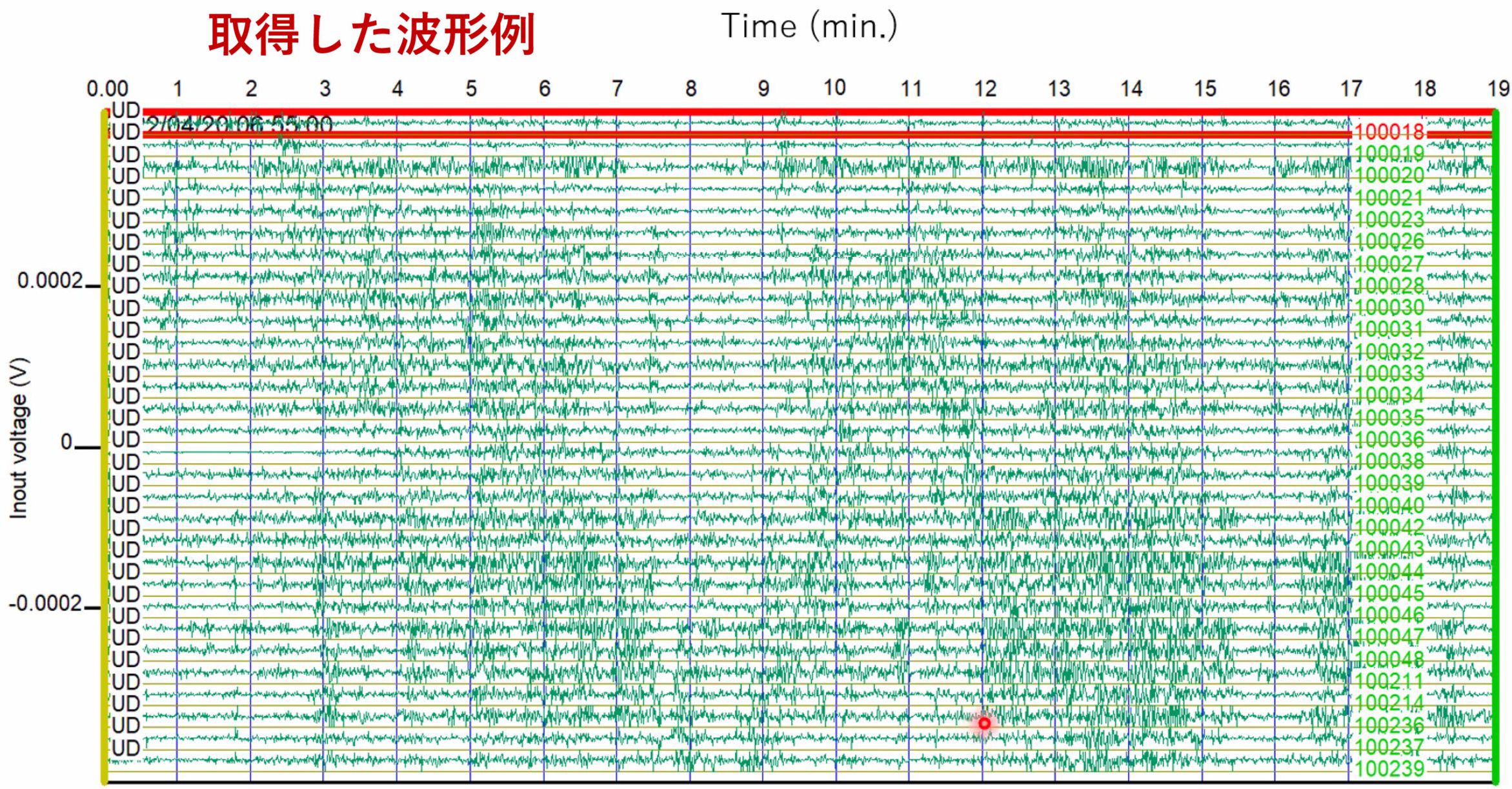 上記表面波探査の解析原理を元に微動アレー探査を行うが、異なるのは人工の起振を行わず無限方向からの自然状態の地盤振動を観測することである。震源が分かっている1方向での解析をどう扱って無限方向での表面波探査の解析に活かせるかの説明は、拙い知見では無理があるので割愛する。実際のデータ取得例を右図に掲げておく。