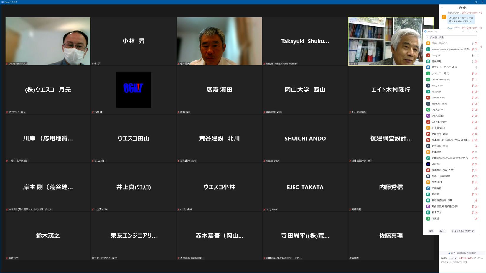 リモートオンラインでの報告会の状況は右のとおりです。西垣先生の開会挨拶の後、主に小西千里様および根本雅夫様(応用地質株式会社技術本部研究開発センター、以下O社)によって、現場測定作業、解析原理、解析結果、地盤性状との対比等の説明がありました。