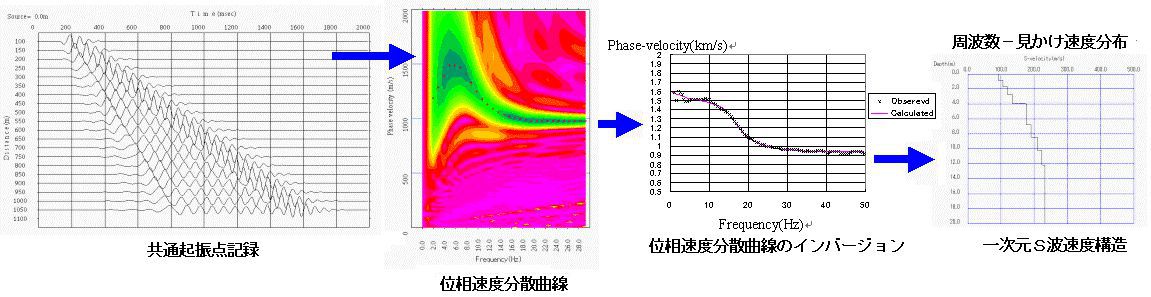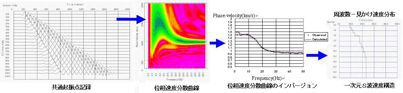 報告会では微動アレー探査結果を理解するために、先ず一般的な人工起震源による表面波(レイリー波)探査の解析原理の紹介がありました。右図(O社研究資料引用編集)に示したように、そこでは表面波を連続的に観測し、そのデータを解析することで、表面波の分散特性(周波数と位相速度との関係)を明らかにし、それを逆解析することで分散曲線を求め、その分散曲線にフィットした鉛直方向のS波1次元構造を試行錯誤で求めるというものです。