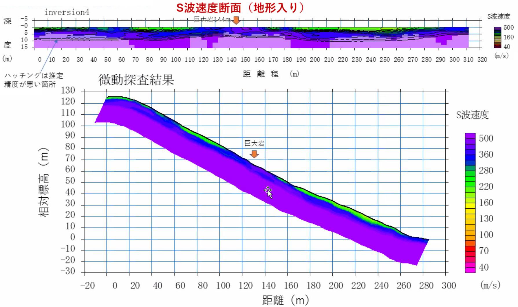 今回の微動アレー探査結果を踏まえると、以下のように対応できよう。やや低速度の層(緑色付近S波速度200m~250m)が斜面中下方の表層に分布しており、この層は締まった2次堆積の崖錐堆積物であり、中上方にやや薄く分布する低速度層は残積土性の風化土であると想定される。中間斜面に露岩が出現しており、その周囲では低速度層は薄くほとんど無い状態であり、ほぼ整合している。